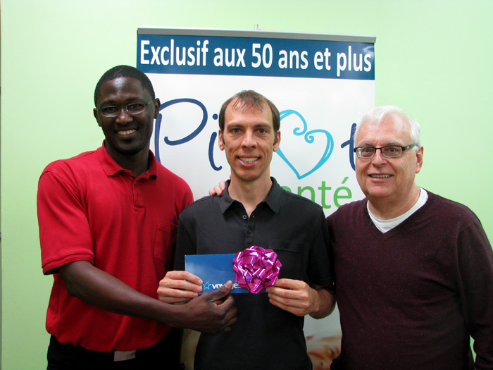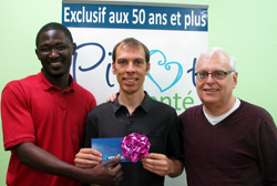 M. Maxime Bériault gagnant du certificat-voyage de 1 500$ accompagné son père M. André Bériault membre de Pivot Santé et de l'organisme Aînés en mouvement et du président de Pivot Santé M. Wendyam Drabo. |