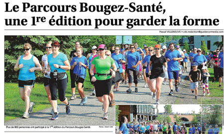 SAINT-HUBERT, LE 2 JUIN 2013 – Plus de 450 participants ont bravé la chaleur et sont venus courir, marcher et danser le 1er juin dernier au Parc de la Cité de Saint-Hubert pour la 2ème édition du Parcours BOUGEZ-SANTÉ organisée par Pivot Santé au profit du Programme Le Bouge-Aînés de l’organisme Aînés en mouvement.